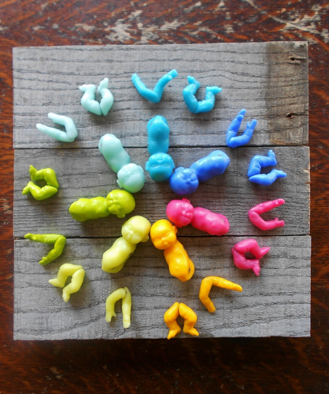 Here is a new piece, yet I’ve been working on it a long time! To me, it is reminiscent of the Cooties game I played as a child. I loved that game! I happen to be infatuated with the concept of Detachment and Regeneration, on the physical, emotional and spiritual levels. I have been casting and resculpting these little babies for ages, and fighting with the encaustic medium to accept little magnets in their joints, so they have limbs that pop on and off. If you’ve ever worked in encaustic medium, you might guess this is quite a feat, since in warm weather the magnets will not grip the wax, and in cold weather, the magnets will pop out of the wax. But, as happens if you only let the Holy Spirit guide you in your studio (or lab), I woke up one morning with the solution. It seems so easy and obvious now. Well, everything holds together with my new found solution, so I quickly whipped these babies into shape, and now I can move on to painting the gameboard. Check in later, if you’re curious….