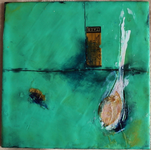 I have begun playing around with Encaustic Wabi Sabi and I love it! The process is very loose and energetic. I have been drying out Tazo tea bags and have discovered that tea bag paper is exquisite to use with Encaustic Wax. Also, you can see I have been using the tea labels! Since I am a colorist, I have decided my new body of work will focus on the powerful use of one color (of course this one color will have many complex undertones, underpainted layers, etc.) and the forms I paint will be simple, scratchy, overworked areas of dense color and layered tea paper. I hope you like it – I really do, and I have begun to save all my tea bags, religiously drying and emptying them for my future students to play with.