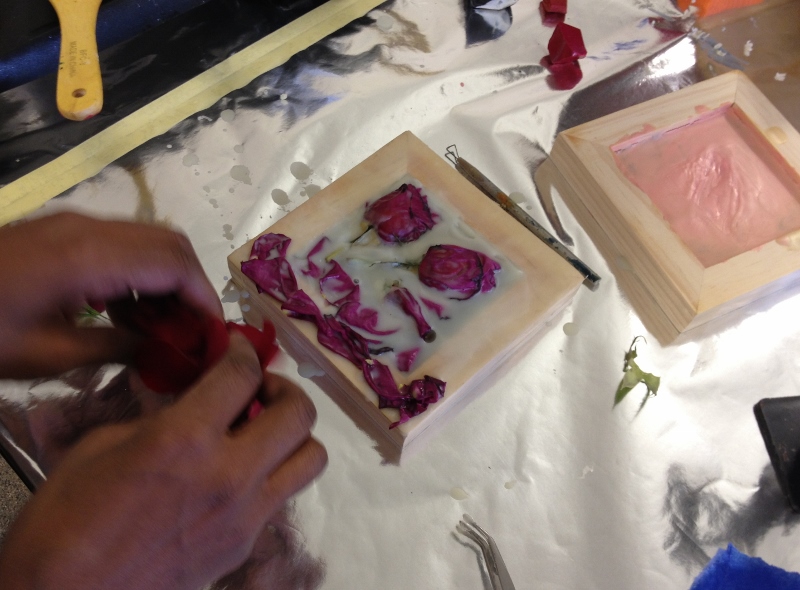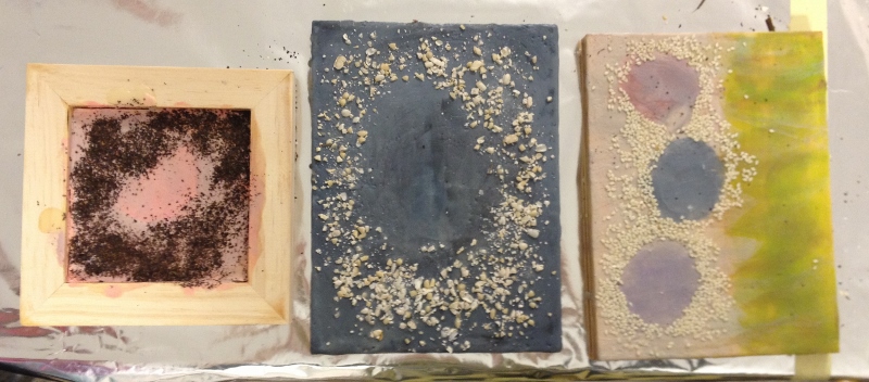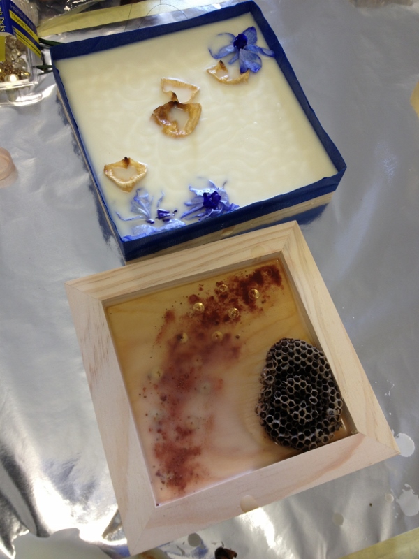 We tried two different pours – one, into the back of a cradle board, filling the recess there with wax, which made a nice, deep pool to embed into. The next, as a raised bed of wax on the front of the board- masked off, Daniella Woolf style.