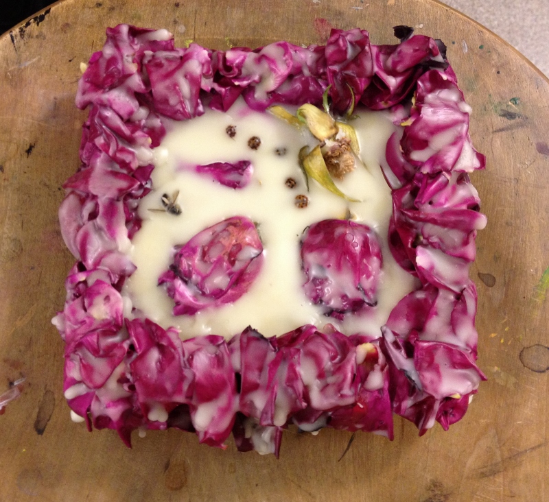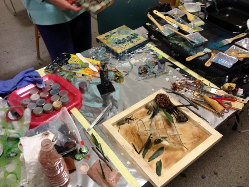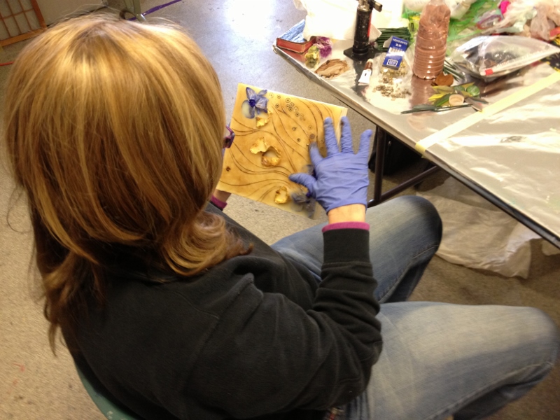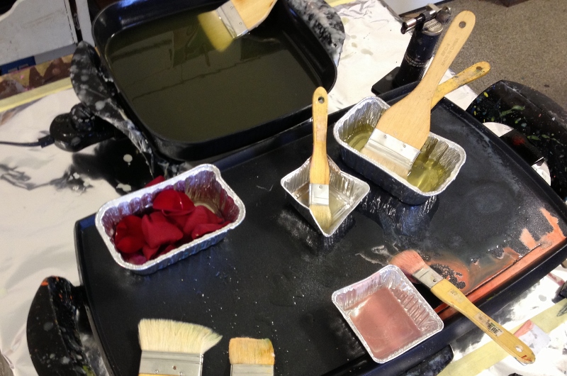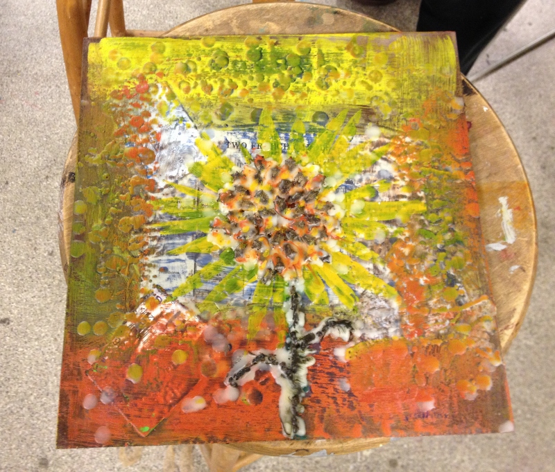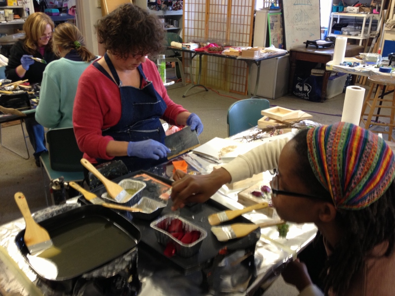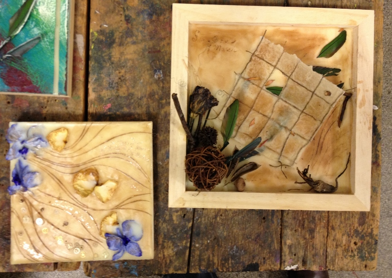 We had great fun in November dipping all types of objects into encaustic wax. I gave each table their own pot of wax, and their own griddle and away we went- experimenting!