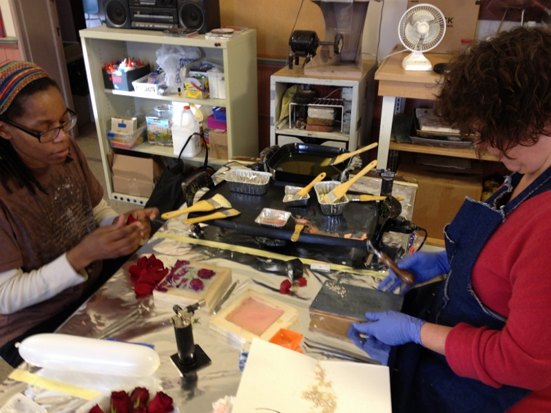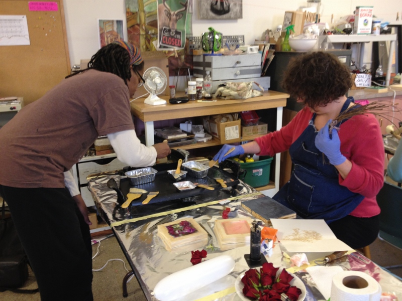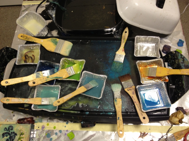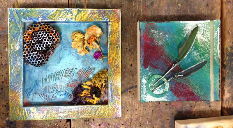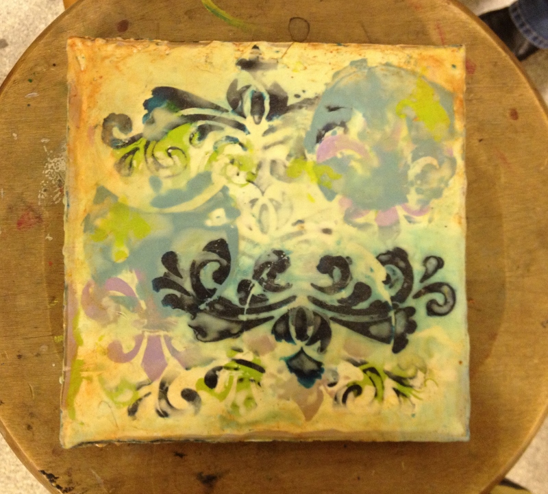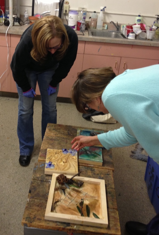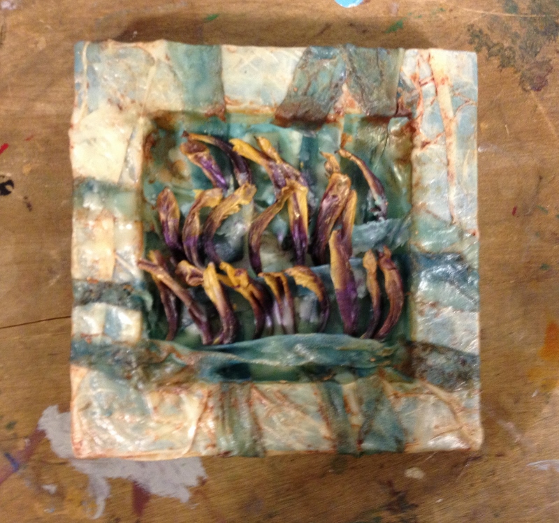 We had great fun in November dipping all types of objects into encaustic wax. I gave each table their own pot of wax, and their own griddle and away we went- experimenting!