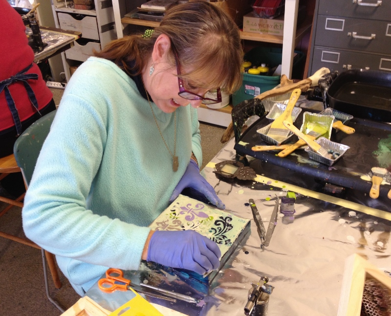 Last Saturday the art room at Oberlin’s historic FAVA building was transformed into an encaustic paradise, when ten artists from the Cleveland area took my Encaustic Wabi Sabi workshop! The students felt like kids at a candy store, only the candy was stained tea bags, …