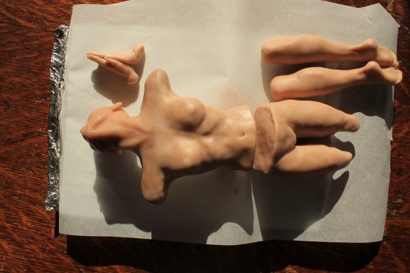 This piece was a polymer woman, still uncured, but she had dried out in a type of partial cure from sitting so long- which led to a long crack forming across her waist. I mean, look at her- she had to lay in such a position for months on her back!